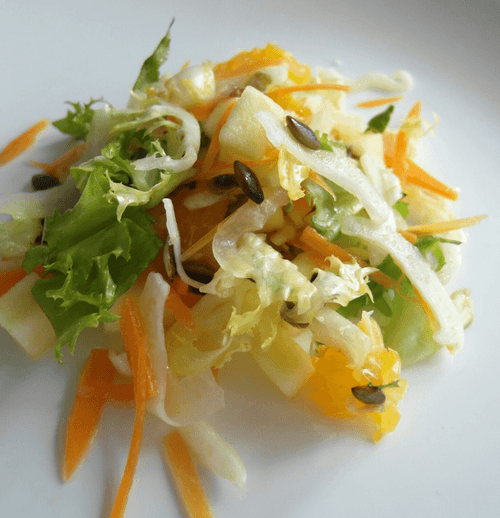 Вегетарианский салат с фенхелем — это легкое и изысканное блюдо европейской кухни, которое объединяет свежесть и хрусткость овощей с мягкими пряными нотами. Фенхель, известный своим анисовым ароматом, придаёт салату утонченное очарование, а хрустящая морковь и сочное яблоко дополняют его сладковатым оттенком. Листья салата корн и фриссе добавляют мягкость и нежность, а обжаренные тыквенные семечки придают легкий ореховый вкус. Заправка из оливкового масла, лимонного сока и гималайской соли подчеркивает свежесть ингредиентов, создавая гармоничный баланс вкусов. Этот салат идеально подходит для лёгкого перекуса или праздничного ужина, освежая и насыщая организм полезными веществами.