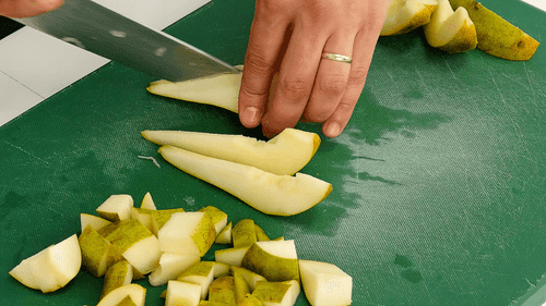 Одну грушу нарезать на произвольные крупные дольки. Вторую нарезать чуть мельче.