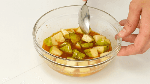 Яблочный уксус, кленовый сироп, кимчи перемешать, и замариновать в этом соусе мелкие кусочки груши.