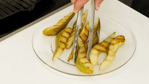 Дольки груши обжарить на гриле на оливковом масле для жарки с веточками тимьяна и розмарина.