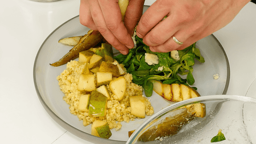 Приготовление печеной груши дарит ей удивительно мягкую пюреобразную текстуру, которая великолепно гармонирует с хорошо проваренным булгуром. Рекомендуется использовать грушу сорта "Конференс", так как ее упругая мякоть прекрасно выдерживает маринад и процесс обжаривания.