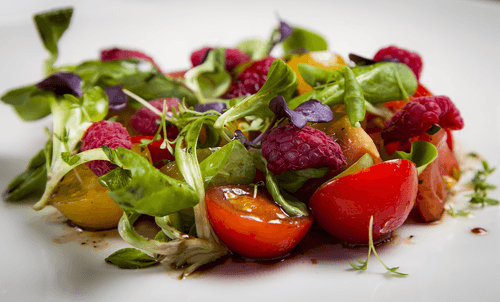 Этот салат – воплощение свежести и гармонии вкусов, вдохновленный турецкой кухней, известной своим искусным сочетанием сладкого и кислого. Три вида томатов – бакинские, классические черри и солнечно-желтые черри – создают яркий и насыщенный вкусовой профиль. Сочная малина добавляет пикантную сладость, идеально дополняя медовый бальзамический соус, который объединяет все ингредиенты в единую мелодию вкусов. Завершают блюдо нежные листочки кресс-салата, кресс-гороха и корн-салата, привнося свежие зеленые нотки. Этот салат – не просто легкая закуска, а настоящее гастрономическое приключение, которое освежает и пробуждает вкус к жизни. Его можно подавать как самостоятельное блюдо или в качестве гарнира к легким летним угощениям.