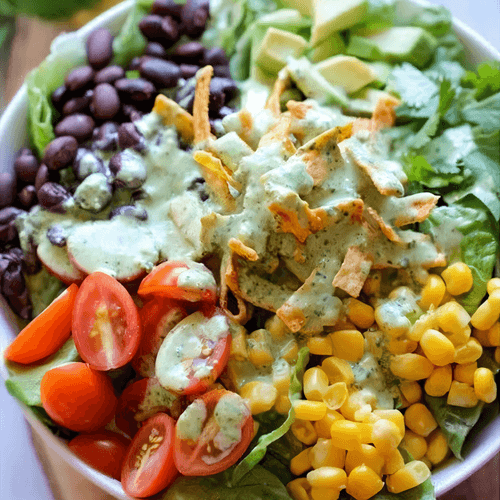 Этот освежающий паназиатский салат с яркой заправкой из кинзы и лайма — настоящая гармония свежести и насыщенного вкуса. Кисло-сладкий лаймовый сок в сочетании с пикантной кинзой и чесноком создают ароматную заправку, которая идеально подчеркивает кремовую текстуру авокадо и сочность помидоров черри. Добавление красной фасоли и кукурузы придает блюду насыщенность, делая его не только легким, но и питательным. Романо придаёт хруст, а натуральный йогурт в заправке делает вкус мягким и сливочным. Этот салат прекрасно сочетается с блюдами азиатской кухни, а также является отличным самостоятельным угощением. Он идеально подойдет для летнего ужина или как экзотическая нотка в повседневном меню.