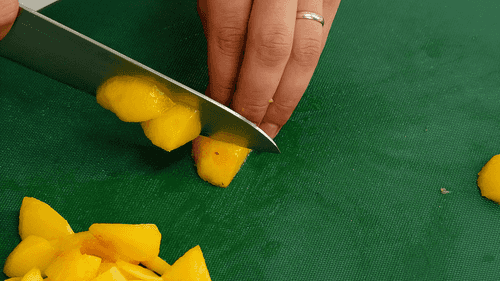 Очистить огурцы, редис, сельдерей персики и авокадо. Все нарезать произвольно, сельдерей нарезать мельче, чем все остальное. Одну редиску не чистить и нарезать колечками, на украшение.