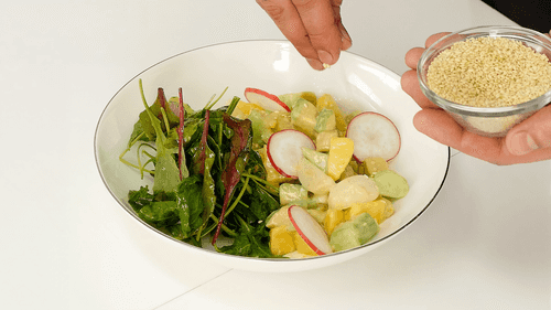 Салатные листья выложить на дно тарелки, сверху овощи с соусом, украсить колечками редиса и кунжутом.