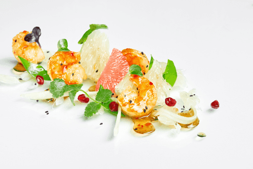 Салат с помело и креветками – яркое блюдо паназиатской кухни, сочетающее свежесть фруктов и морепродуктов с изысканным балансом сладости, кислинки и умами. Основной ингредиент – помело, который в Юго-Восточной Азии считают символом достатка и процветания. Сочные кусочки цитруса гармонично дополняются хрустящими огурцами, кенийской фасолью и сегментами грейпфрута. Хрустящий арахис и сладкие личи добавляют текстурную сложность, а зерна граната придают свежесть. Жареные креветки в воздушной корочке из желтка и крахмала создают контраст между хрустящей оболочкой и нежностью внутри. Рыбный соус объединяет все вкусовые оттенки, а кинза и черный кунжут завершают композицию. Это блюдо идеально для легкого ужина или праздничного застолья, где каждый ингредиент подчеркивает сложность вкуса и утонченность азиатской гастрономии.