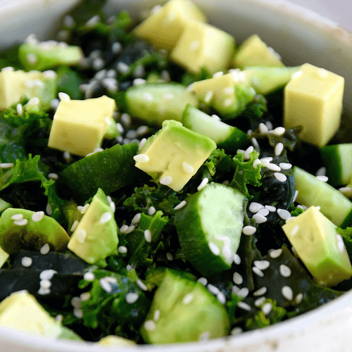 Смешать айсберг, огурцы, авокадо, салат чукка и кунжут.