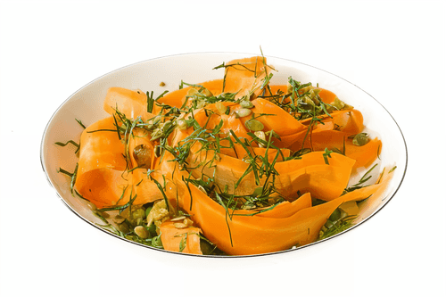 Этот салат – гармония свежести и ярких вкусов. Европейская кухня всегда славилась своей способностью сочетать простые ингредиенты в элегантных блюдах, и этот салат – прекрасное тому подтверждение. Сладкие, сочные дольки апельсина дарят освежающий цитрусовый оттенок, а нежный зеленый горошек придаёт лёгкость. Ленты моркови добавляют хрустящую текстуру и натуральную сладость, а тыквенные семечки вносят лёгкую ореховую нотку. Оливки придают пикантность, а оливковое масло и свежая петрушка связывают все компоненты воедино. Этот салат идеален как лёгкая закуска или гарнир, особенно в весенне-летний сезон. Он украсит ваш стол, радуя глаз и даря великолепный вкус.
