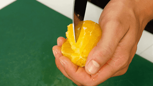 Апельсин ножом очистить от кожи и вырезать филе, избегая пленок и белых частей. Из остатков выжать немного сока в горошек.