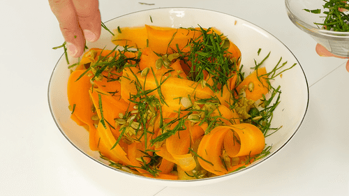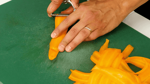 Морковь очистить и нарезать на ленты при помощи овощечистки.