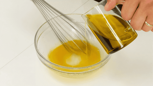 К апельсиновому соку добавить рисовый уксус, сахар, соль. Взбить венчином, постепенно вливая оливковое масло.