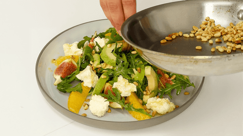 Рукколу смешать половиной заправки. Выложить на тарелку рукколу, аккуратно уложить дольки апельсина, инжира и кусочки сыра, полить оставшимся соусом, украсить жареными кедровыми орехами.
