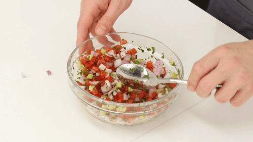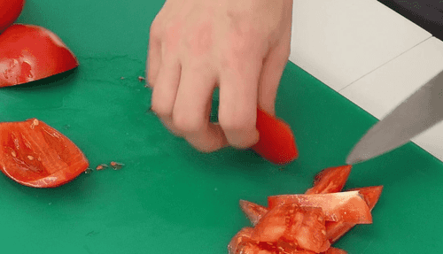 Для салата нарезать небольшими кубиками помидоры и огурцы, удалив из них семена.