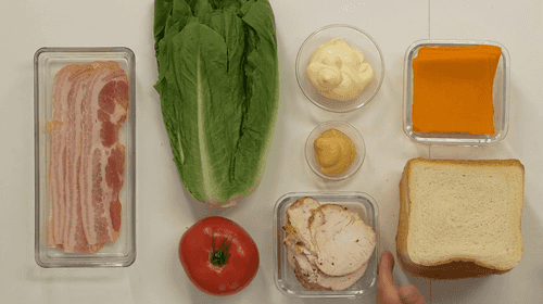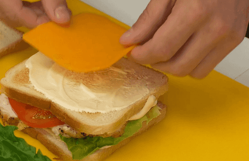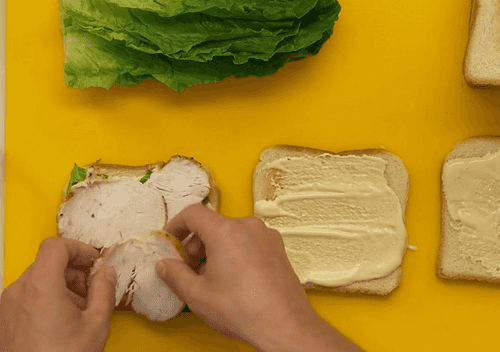 Собрать сэндвич: на нижний тост положить лист салата, затем кусочек сыра, пару ломтиков индейки, колечки помидора.
