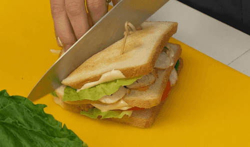 Воткнуть в сэндвич две шпажки, чтобы он не развалился, и разрезать его по диагонали.