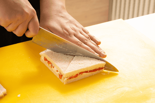 Острым ножом обрезать у сэндвичей корки, затем нарезать их на треугольники, два раза разрезав по диагонали.