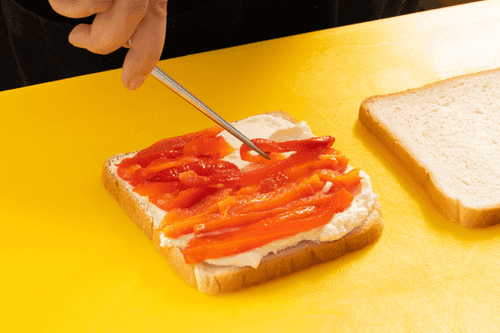 Сверху выложить полоски перца, накрыть оставшимися ломтиками хлеба.