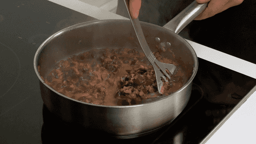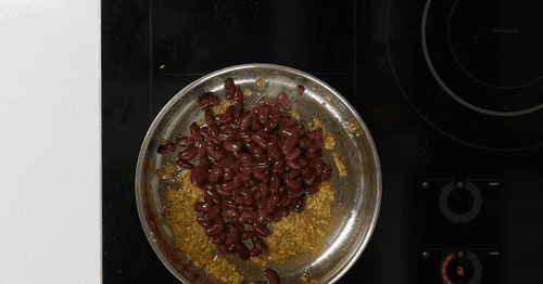 Добавить к луку зиру и чили, выдавить чеснок через пресс, обжаривать 30 секунд, затем добавить процеженную фасоль и полстакана воды, перемешать, накрыть крышкой и тушить 5 минут.