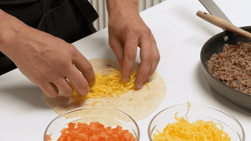 На теплую тортилью выложить тертый сыр, мясо с фасолью, нарезанные кубиками помидоры. Сложить верхний и нижний концы буррито, а затем скрутить его.