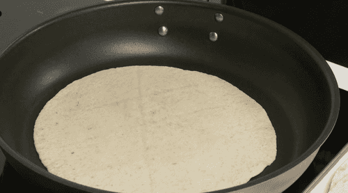 На сухой сковороде подогреть тортилью по 30 секунд с каждой стороны.