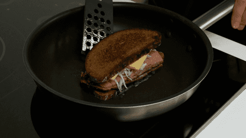 Разогреть сковороду на среднем огне и поджарить на ней сэндвичи по 3 минуты с каждой стороны.