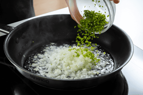 Добавить в сковороду мелкорубленный лук, рубленные стебли кинзы и обжарить, чтобы лук стал прозрачным.
