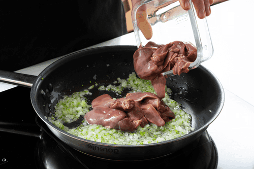 Добавить печень и, помешивая, обжарить до мягкости — примерно 10 минут. Печень должна прожариться, но остаться чуть розоватой и мягкой внутри.