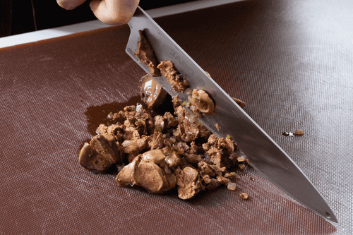Половину печени выложить в блендер и измельчить до гладкости, вторую – нарезать и размять в массу с кусочками. Перемешать обе массы, чтобы получился грубый пашет.