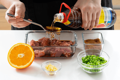 Приготовить свинину. Нарезать ее тонкими ломтиками, сложить в миску, добавить 2 столовых ложки соевого соуса, апельсиновый сок, рыбный соус, тростниковый сахар, измельченный чеснок и рубленый зеленый лук. Дать постоять 5–10 минут.