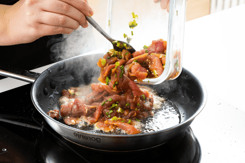 Обжарить свинину на разогретой сковороде с небольшим количеством растительного масла со всех сторон 5–7 минут до румяного цвета.