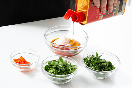 Приготовить соус. Листья кинзы и мяты порубить. Смешать с майонезом, кетчупом, столовой ложкой соевого соуса и кунжутным маслом. Перец чили тонко нарезать, семена удалить. Добавить в соус перец чили по вкусу, посолить и перемешать.