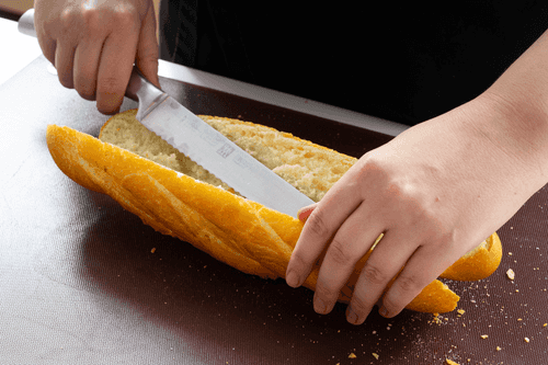 Багет прогреть на гриле или в духовке и сделать вдоль глубокий разрез, не дорезая до края.