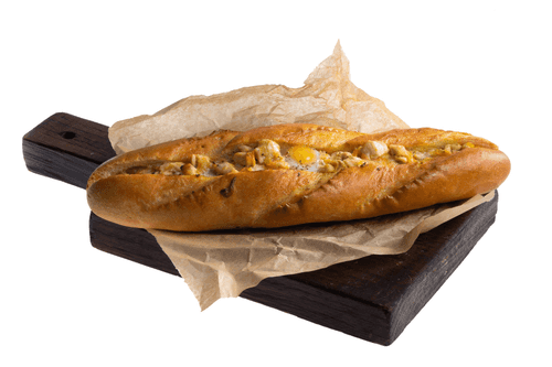Из-за продольного разреза этот бутерброд на багете обретает внезапное сходство с хачапури по-аджарски, а нагружен он чем-то вроде американского салата «Вальдорф», в котором те же смысловые ингредиенты: вареная куриная грудка, черешковый сельдерей и сметанный соус. В любом другом случае такой оксюморон мог бы вызвать вопросы, но легкомысленный жанр закусок позволяет и не такие странные сближения; главное, что готовится бутерброд за минуты, получается сочным и его удобно брать руками, не боясь, что половина начинки выскользнет на колени. Вареную курицу можно заменить на тунца из банки, добавить в начинку ветчину или даже докторскую колбасу — ориентируйтесь на ситуацию в вашем холодильнике.