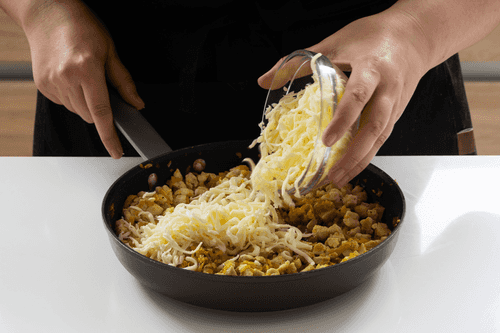 Смешать овощи и курицу с натертой или мелконарезанной моцареллой для пиццы.
