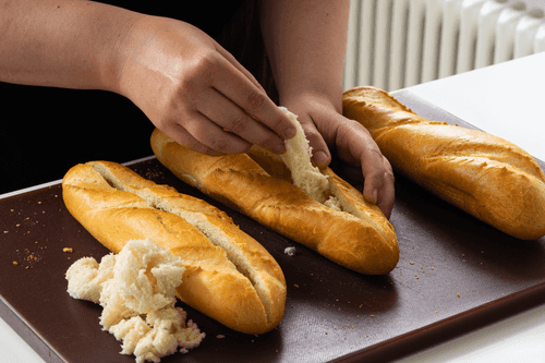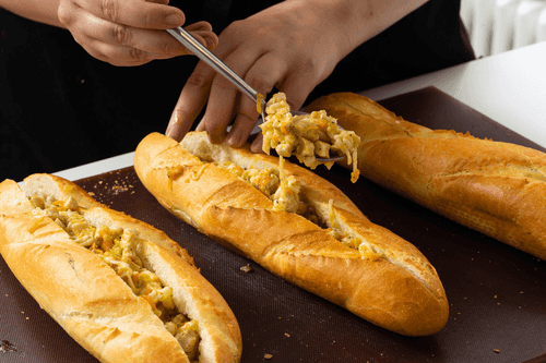Багеты надрезать вдоль, вынуть мякоть так, чтобы получились лодочки.