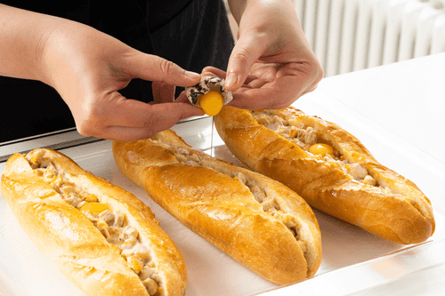 Выложить багеты в смазанную маслом форму разрезом вверх. Смазать каждый багет маслом при помощи кисточки, внутрь каждого разреза разбить перепелиное яйцо так, чтобы желток остался целым. Отправить в разогретую до 180 градусов духовку на 15–20 минут.