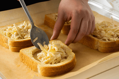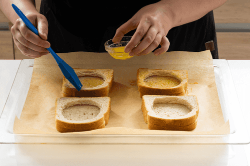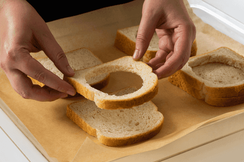 Выложить на противень, застеленный пекарской бумагой, четыре оставшихся куска хлеба, сверху — куски с отверстиями.