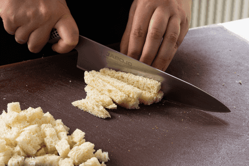 Вынутые серединки хлеба нарезать мелкими кубиками.