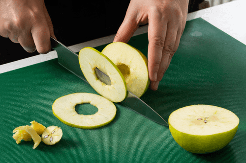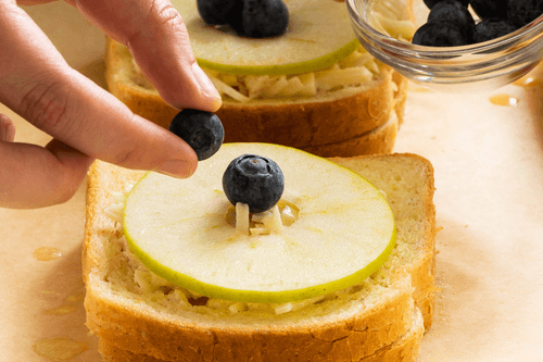 Яблоко разрезать пополам, вынуть сердцевину и нарезать четыре тонких круга — по количеству бутербродов. Сбрызнуть их лимонным соком.