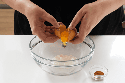 Разбить яйцо в миску, добавить йогурт, щепотку корицы и хорошо перемешать.