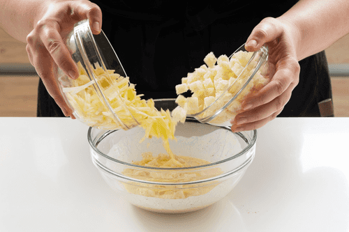 Перемешать и сразу, не давая начинке раскиснуть, выложить в корзиночки.