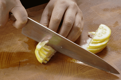Лимон тщательно вымыть и нарезать очень тонкими дольками.