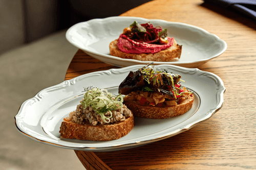 Бутерброды с баклажановой икрой, свекольным муссом и грибной икрой