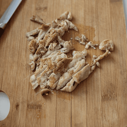 Куриное филе обжарить до готовности и нарезать тонкими полосками.