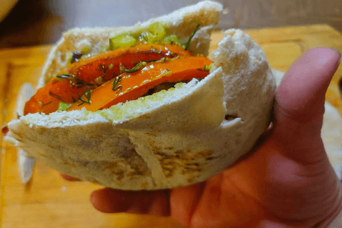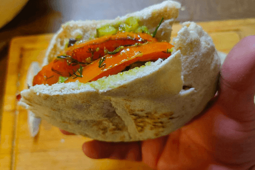 Жареные овощи в пите — это яркое и ароматное блюдо европейской кухни, сочетающее в себе простоту приготовления и богатство вкусов. Корни рецепта уходят в средиземноморскую традицию, где свежие овощи и зелень играют ключевую роль. Нежные кусочки баклажана, кабачка и сладкого перца обжариваются до золотистой корочки, сохраняя свою сочность и насыщенный вкус. Добавление ароматного песто придает начинке пикантность и глубокий травяной оттенок. Пита, мягкий хлеб с карманом, аккуратно удерживает все ингредиенты, позволяя насладиться каждым кусочком. Это блюдо идеально подойдет для легкого обеда или ужина, а также станет отличным вариантом для пикника или перекуса. Освежающий укроп и возможность добавить дополнительный соус делают его универсальным и привлекательным для любителей свежих и насыщенных вкусов.