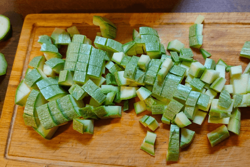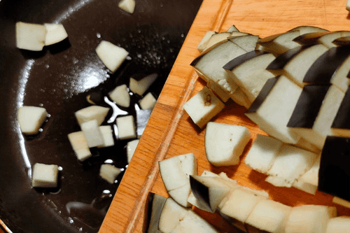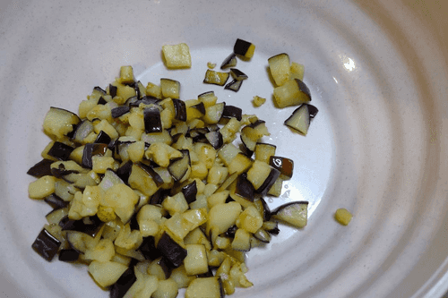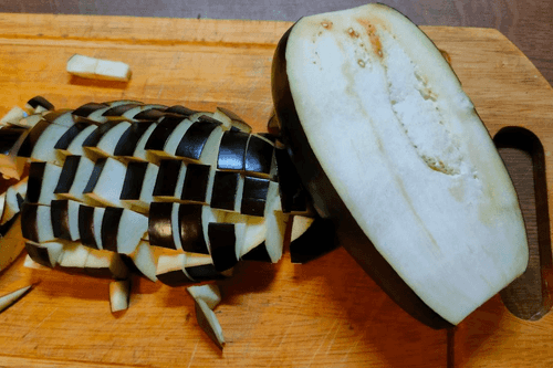 Баклажан разрезать вдоль, затем на мелкие кусочки.