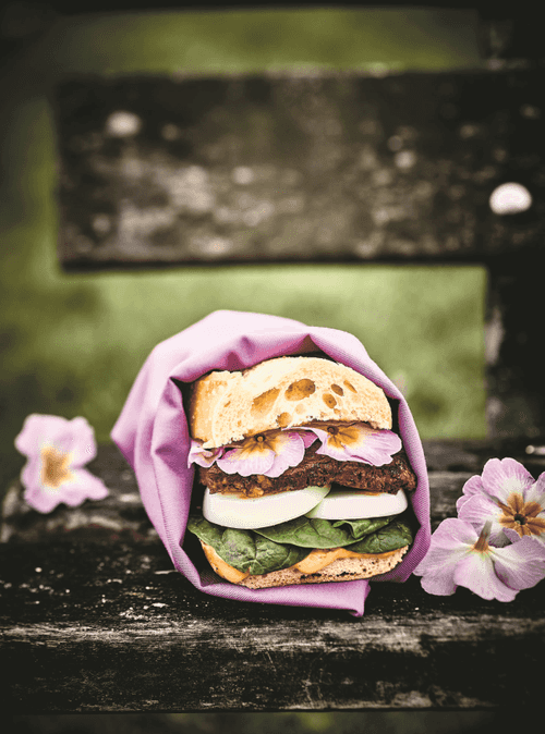 Смазать куски хлеба острым майонезом и собрать сэндвичи: на багет положить шпинат, затем яйца, кусок мяса. Наконец, положить сверху мяса несколько съедобных цветков и накрыть верхней частью багета.