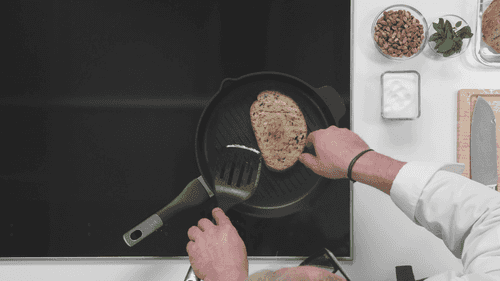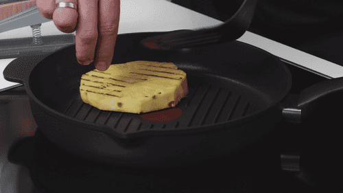 Разогреть сковороду-гриль и обжарить на ней ананас до красивого рисунка.