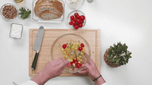 Смешать ананас, черри и базилик, добавить оливковое масло, соль и оставить мариноваться на несколько минут.