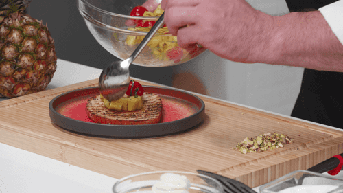 На хлеб выложить ананасы с черри, сверху выложить буррату, посыпать фисташками, полить базамическим кремом.